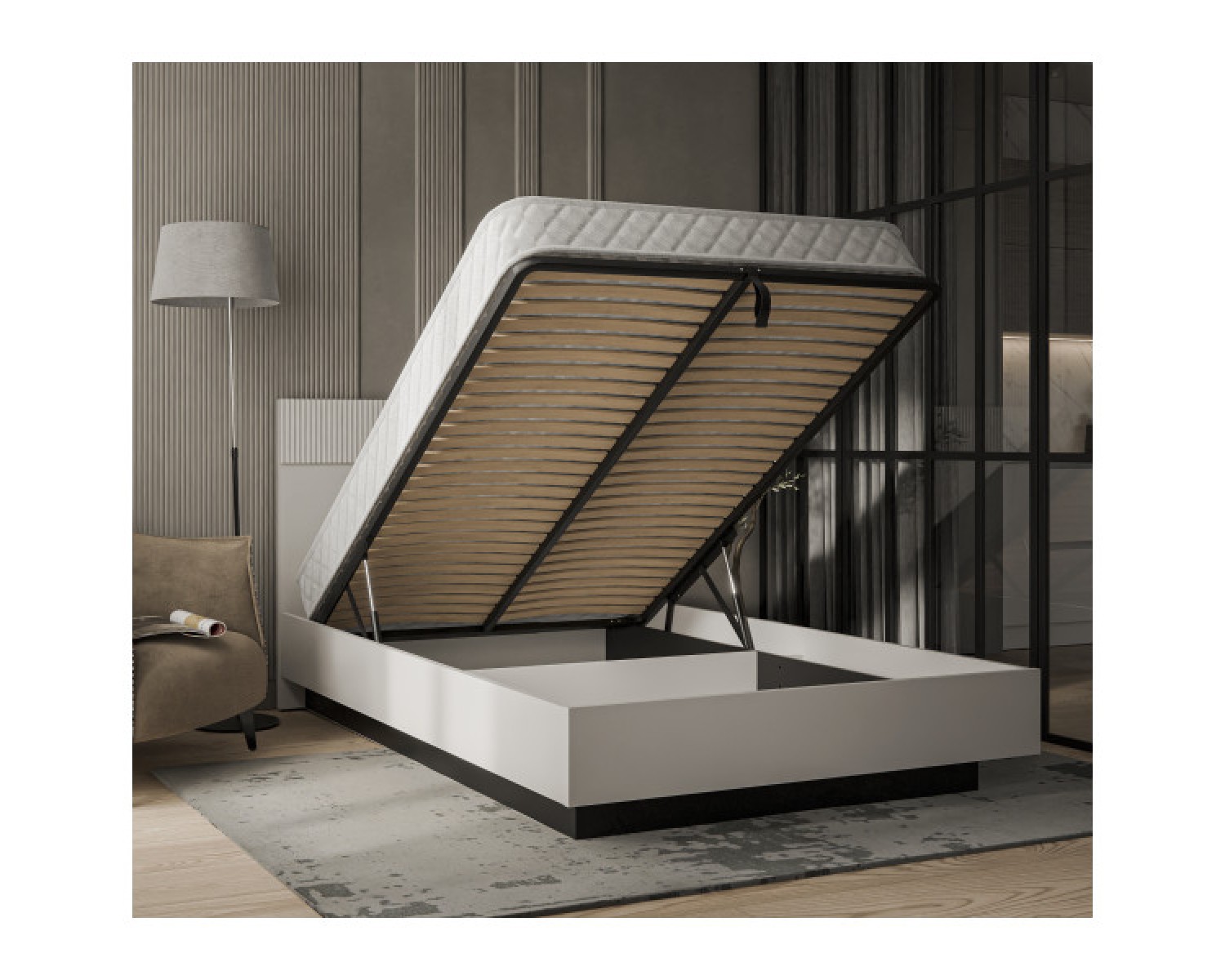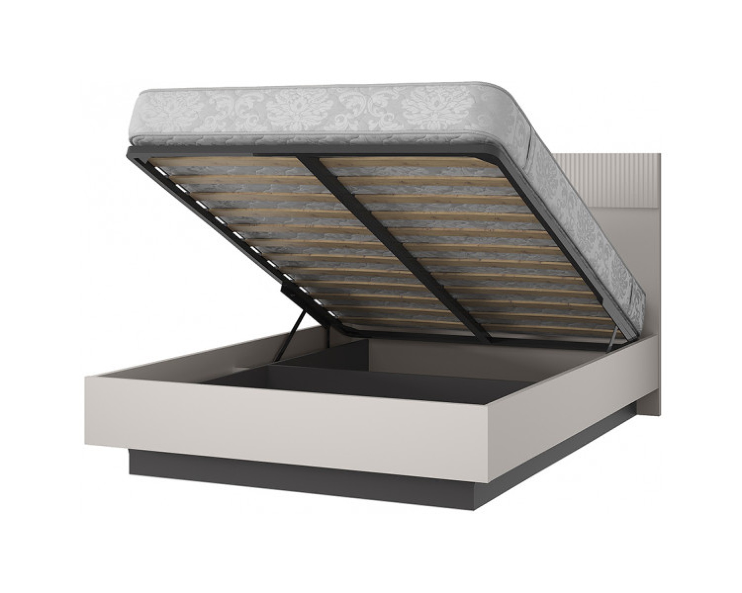 Кровать 140 с подъёмным механизмом VINATI. Организация зоны сна и отдыха в молодёжной комнате и спальне. Кровать полуторная, размер спального места – 1400*2000 мм (ширина – 1454 мм, высота – 1107 мм, глубина – 2064 мм). Конструкция кровати представляет собой сплошное изголовье прямоугольной формы (с вставкой из МДФ) и изножье прямоугольной формы, царги и металлическое основание с подъёмным механизмом, большой вместительные короб для хранения вещей, белья и предметов быта. Деревянные ламели служат дополнительной амортизирующей основой.