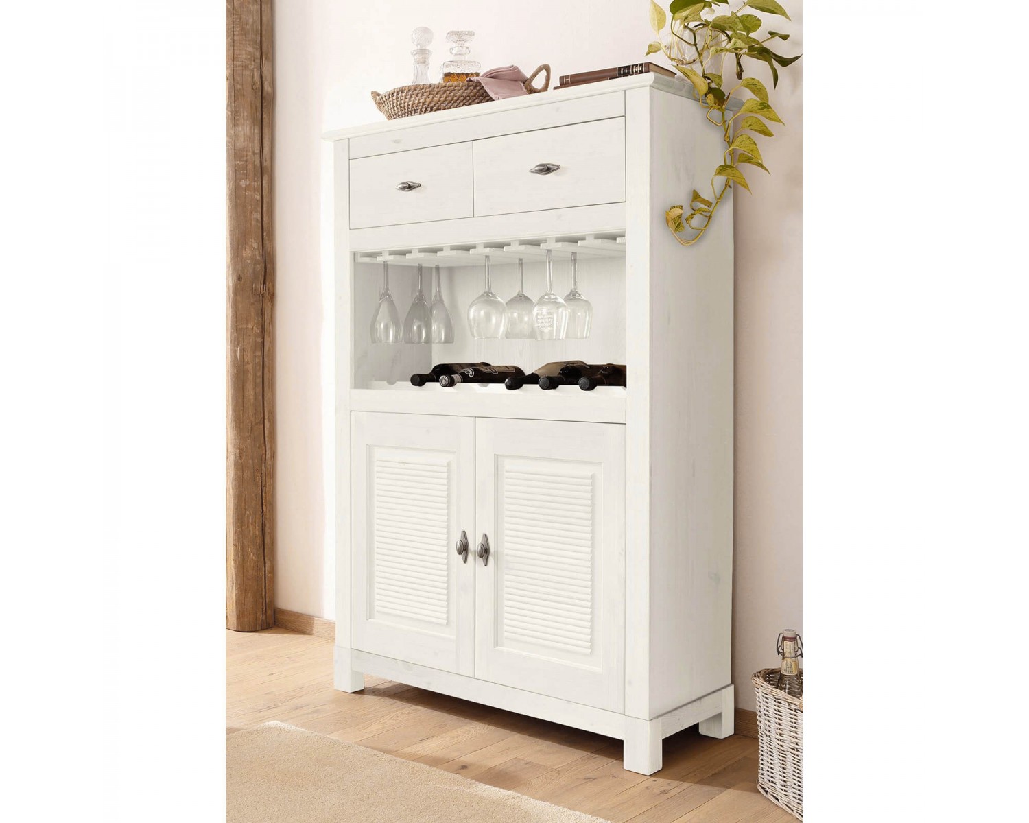 Представляем Вам привлекательный комод-бар "Рауна" (белый воск УКВ) из массива сосны для столовой или гостиной.