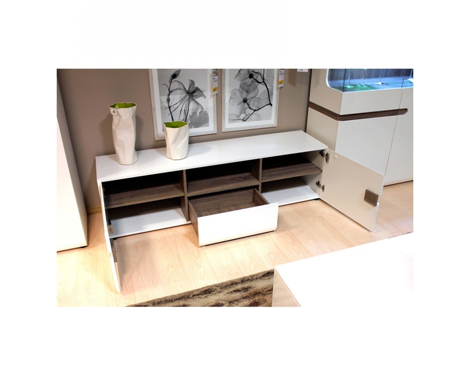 Гостиная Линате Вариант 2 в современном стиле, отличается качественными экологичными материалами и минималистичным дизайном. Сочетание белого глянца с древесной текстурой. Нетрадиционный дизайн коллекции LINATE — это отличный вариант для тех, кто всегда следует новым веяниям моды. Белый глянцевый фасад, оригинальное исполнение ручек, в виде J-образных канавок, направляющие скрытого монтажа с доводчиками, а также необычный дизайн всей коллекции подчеркнет индивидуальность владельца, его стремление к оригинальности и новизне.