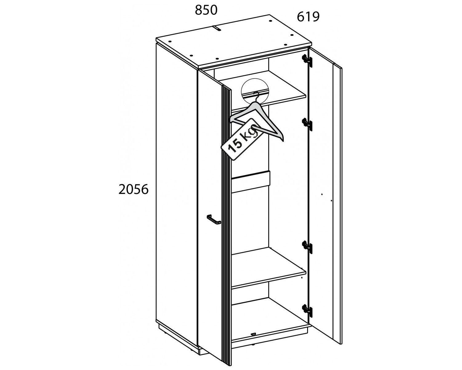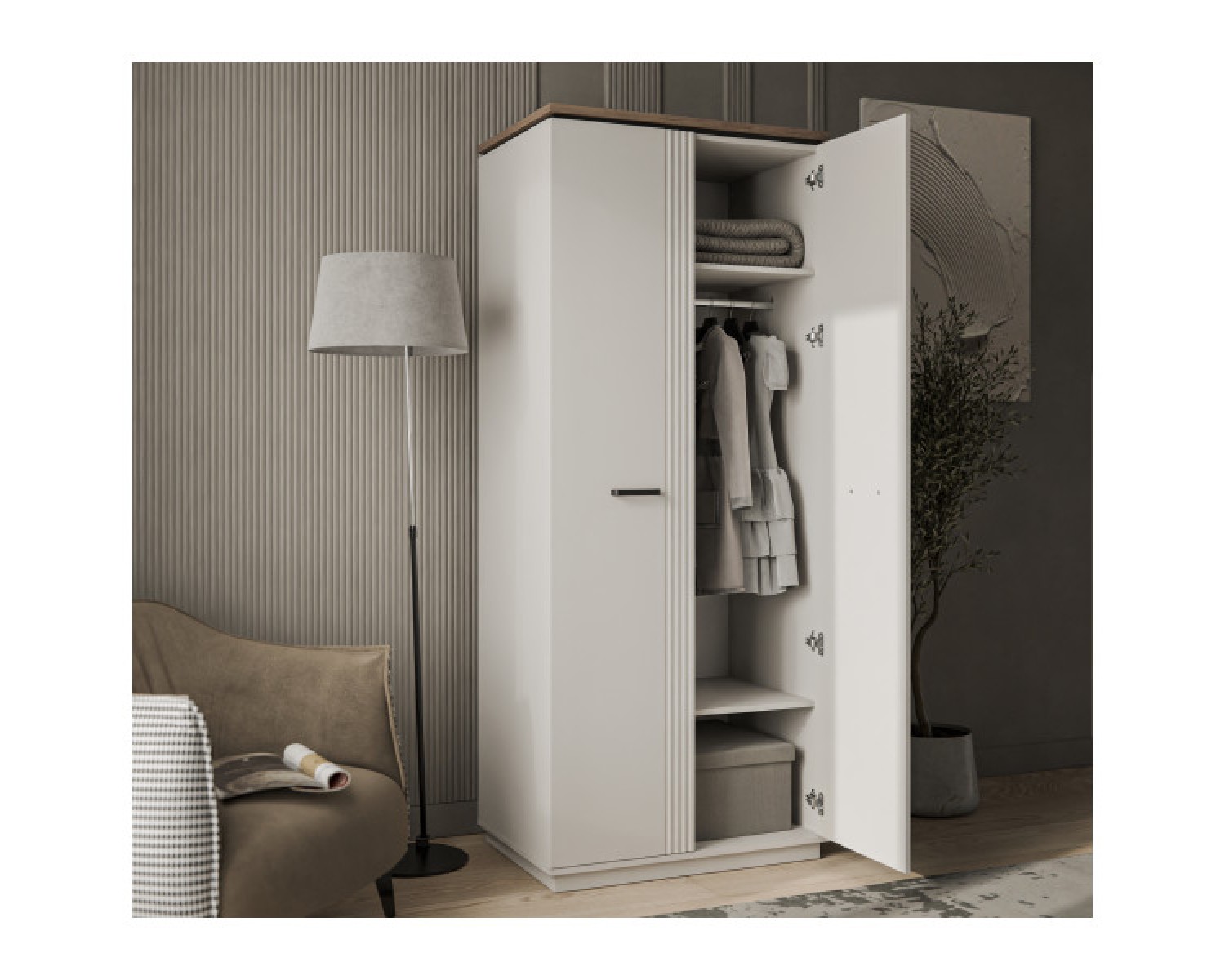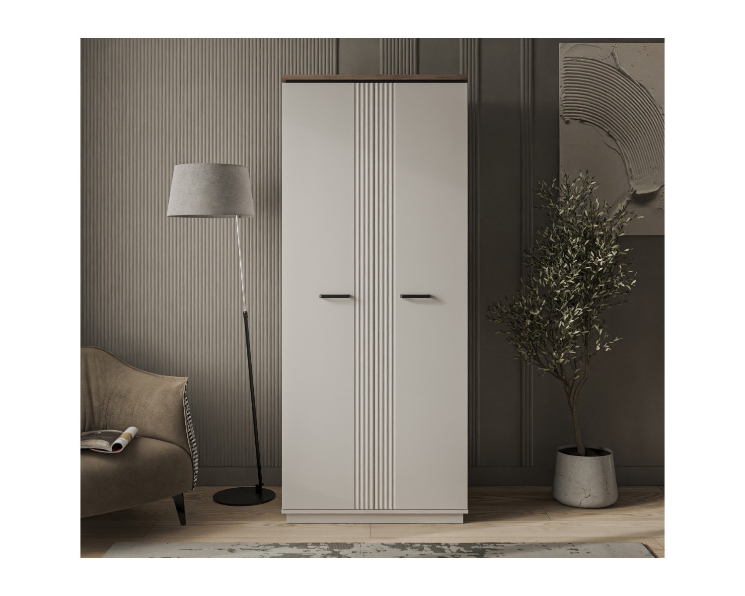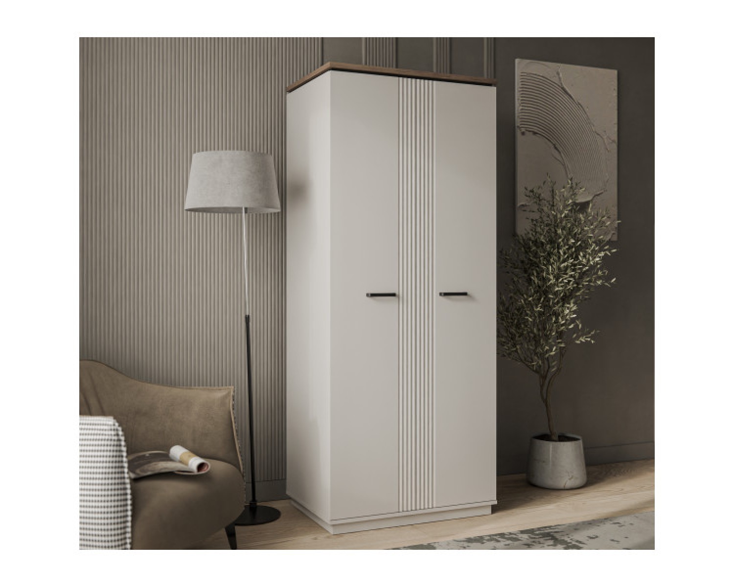 Шкаф 2DG VINATI – универсальный предмет мебели – может быть установлен в интерьере и спальни, и молодёжной/детской комнаты, и даже в гостиной. Конструкция шкафа 2DG VINATI прямая, представляет собой одно гардеробное отделение (G) с двумя нишами и одной стационарной штангой за двумя глухими дверями. Двери (2D) распашные, крепятся к боковому корпусу изделия. Особенностью элемента является эстетический внешний вид, комплектация петлями с доводчиками.