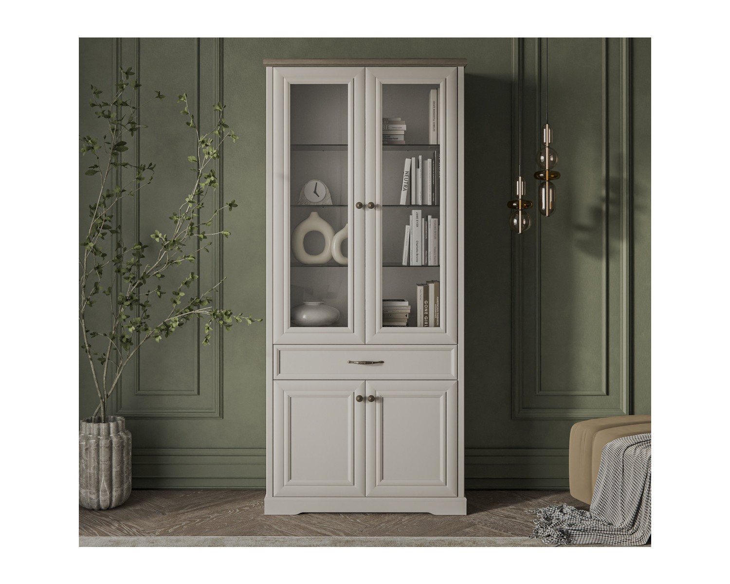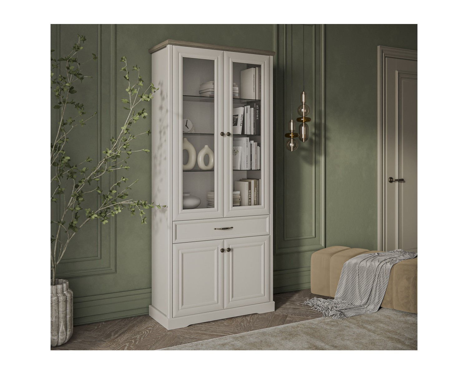 Материал: рамочно-филенчатая конструкция глухого фасада, рамка МДФ – 19 мм, филенка ЛДСП – 8 мм, цвет – персидский жемчуг 810 PO; витрина – закалённое стекло, 4 мм в рамке МДФ; фасады выдвижных ящиков – ЛДСП (16 мм - основа), МДФ (9 мм - планка), цвет – персидский жемчуг 810 PO.