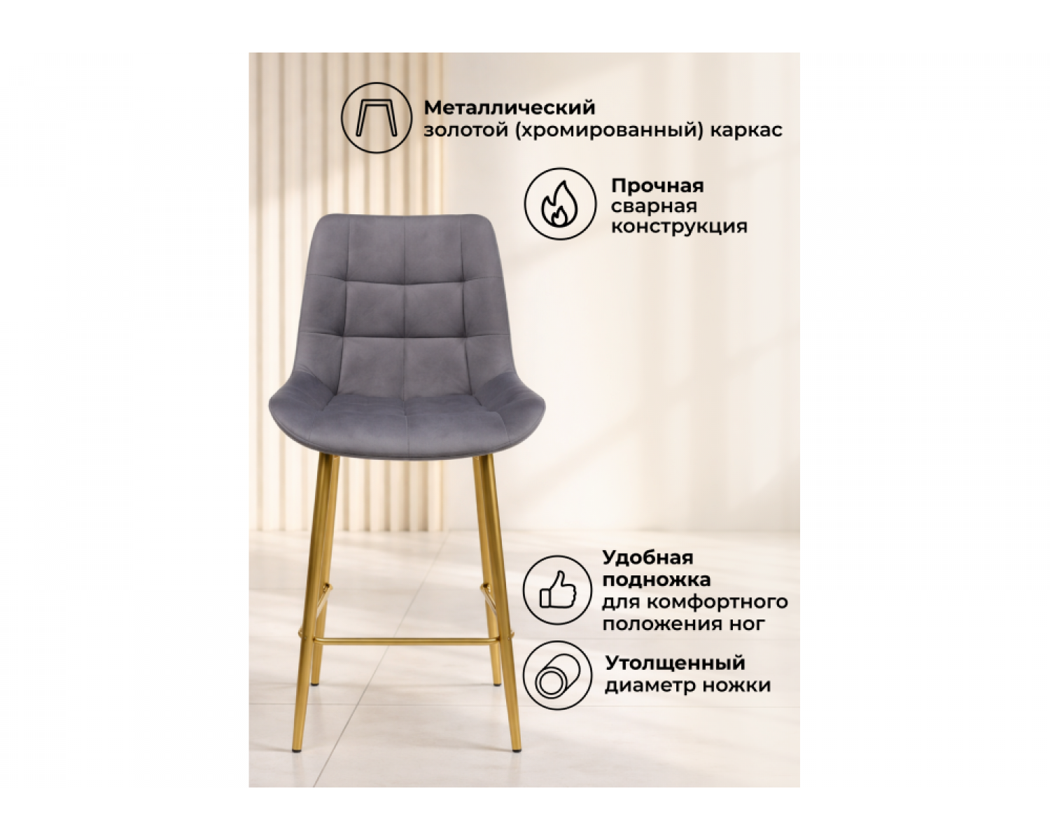 Полубарный стул Челси 360 темно-серый (zd 995) / золотой идеально впишется в любой интерьер, украшая повседневную жизнь. Уникальный дизайн и трендовый цвет создаст ощущение уюта и тепла в любом помещении.