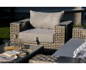 Вместительная лаунж-зона «Тито» состоит из: - трехместного дивана – 2280×920×610 мм. - двух кресел – 1120×920×610 мм. - журнального столика – 1290×670×310 мм. Корпус мебели изготовлен из прочного алюминия и оплетен вручную плоским искусственным ротангом. Цвет серый. Подлокотники плетеного дивана и кресел оснащены алюминиевыми подставками, на которые можно поставить бокал или тарелку. В комплект входят серые подушки со съемными чехлами. Они пошиты из полиэстера, плотностью 300гр/м2. Защитные свойства ткани усилены влагоотталкивающей пропиткой. Журнальный столик выполнен в аналогичной технике, дополняет его стеклянная столешница – 5 мм. Она крепится на вакуумные присоски и поставляется в собранном виде.
